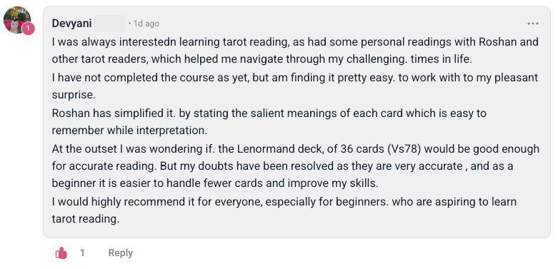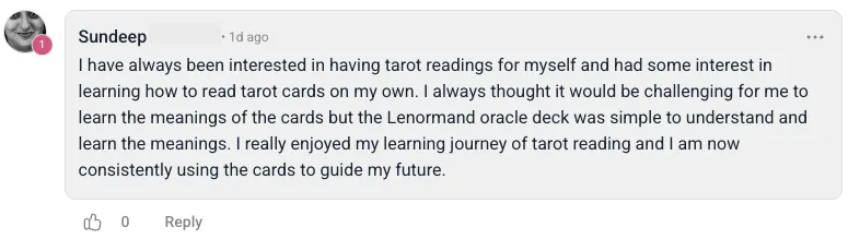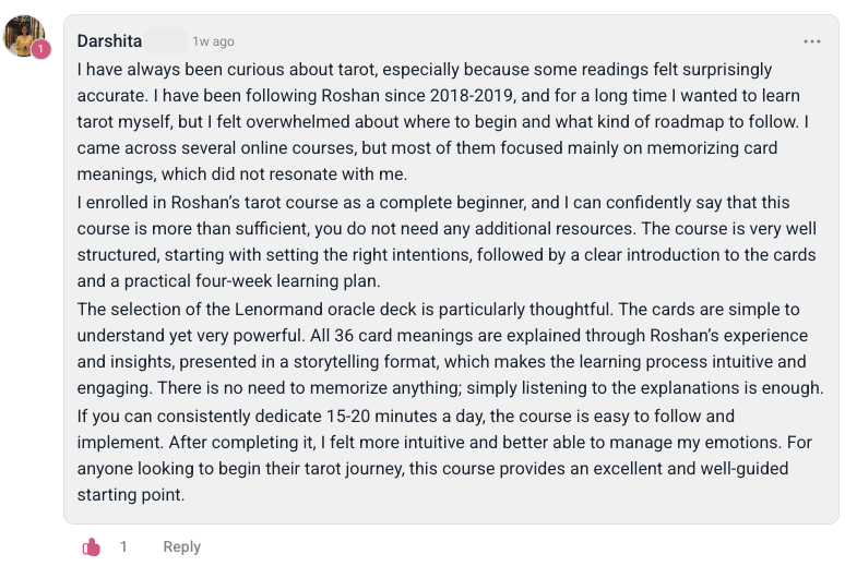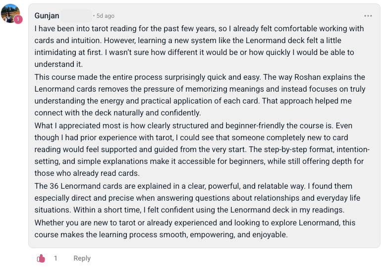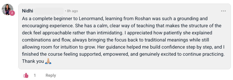 "As a complete beginner to Lenormand, learning from Roshan was such a grounding and encouraging experience." "Her guidance helped me build confidence step by step, and I finished the course feeling supported, empowered, and genuinely excited to continue practicing. Thank you 🙏🏼"