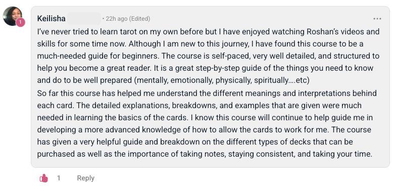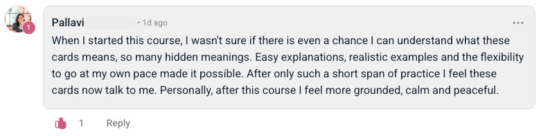 "A much-needed guide for beginners — self-paced, very well detailed, and structured to help you become a great reader." "A great step-by-step guide of the things you need to know and do to be well prepared — mentally, emotionally, physically, spiritually." "This course has helped me understand the different meanings and interpretations behind each card."